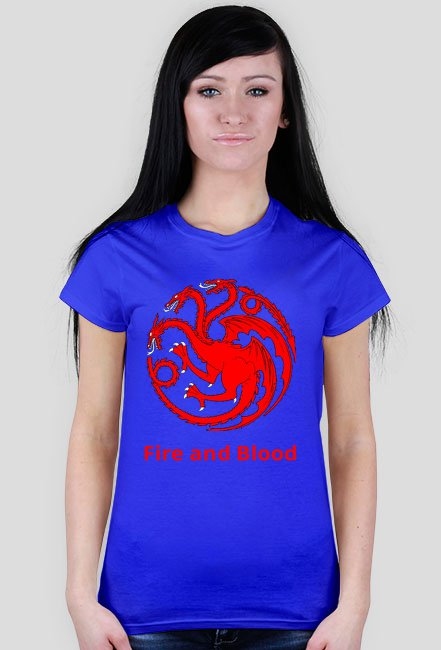Piękna kobieca koszulka z nadrukowanym herbem rodu Targaryen ,,CZERWONYM TRÓJGŁOWYM SMOKIEM'' na czarnym tle oraz z dewizą rodu ,,FIRE AND BLOOD''. Koszulka została stworzona dla fanów serialu i książki ,,GAME OF THRONES'' a szczególnie tych sympatyzujących z rodem Targaryen. Produkt ten doskonale sprawdzi się jako prezent dla fanów serii !!!