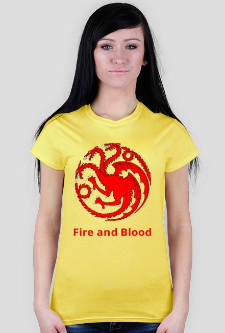 Piękna kobieca koszulka z nadrukowanym herbem rodu Targaryen ,,CZERWONYM TRÓJGŁOWYM SMOKIEM'' na czarnym tle oraz z dewizą rodu ,,FIRE AND BLOOD''. Koszulka została stworzona dla fanów serialu i książki ,,GAME OF THRONES'' a szczególnie tych sympatyzujących z rodem Targaryen. Produkt ten doskonale sprawdzi się jako prezent dla fanów serii !!!