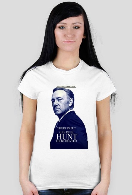 Piękna kobieca koszulka z nadrukowanym napisem ,,THERE IS BUT ONE RULE: HUNT OR BE HUNTED'' umieszczonym na grafice kongresmena FRANKA UNDERWOODA. Produkt został stworzony dla fanek serialu ,,HOUSE OF CARDS''. Doskonale sprawdzi się on jako prezent dla fanek serii !!!