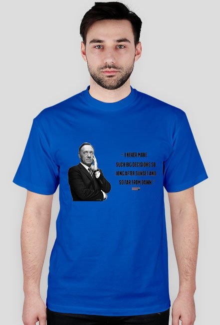 Piękna męska koszulka z nadrukowanym napisem ,,I NEVER MAKE SUCH BIG DECISIONS SO LONG AFTER SUNSET AND SO FAR FROM DAWN'' oraz grafiką kongresmena Franka Underwooda. Produkt jest przeznaczony dla fanów serialu ,,HOUSE OF CARDS'', a szczególnie miłośników głównego bohatera !!!