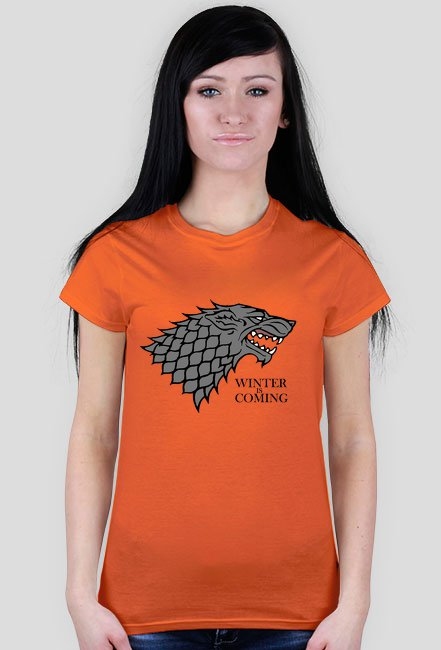 Piękna kobieca koszulka z nadrukowanym herbem rodu Stark ,,SZARYM WILKOREM'' na białym tle oraz z dewizą rodu ,,WINTER IS COMING''. Koszulka została stworzona dla fanek serialu i książki ,,GAME OF THRONES'' a szczególnie tych sympatyzujących z rodem Stark. Produkt ten doskonale sprawdzi się jako prezent dla fanów serii !!!