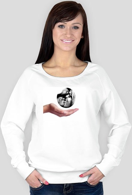 Modelka ma na sobie bluzę w rozmiarze S. Maksymalne wymiary nadruku to 30cm (szerokość)