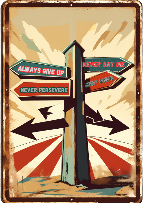 Ten obraz w stylu retro oddaje istotę wyboru na życiowych rozdrożach. Drogowskaz, wskazujący w dwóch przeciwnych kierunkach, symbolizuje zawsze aktualną decyzję między prostotą poddania się a wyzwaniem wytrwałości. Ścieżka najmniejszego oporu kusi obietnicami komfortu, podczas gdy droga mniej uczęszczana wymaga odporności i wytrwałości. Ostatecznie obraz służy jako wyraźne przypomnienie, że chociaż poddanie się może być łatwiejszą ścieżką, dążenie do naszych celów definiuje naszą podróż.