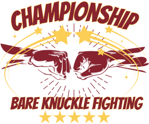 Obraz przedstawia grafikę zaciśniętych pięści uderzających się nawzajem, z napisem "Championship Bare Knuckle Fighting" nad nimi. Grafika ta odnosi się do sportu, jakim jest boks na gołe pięści