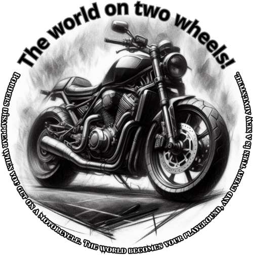 Obraz jest czarno-białym rysunkiem ołówkiem, przedstawiającym szczegółowy motocykl. Motocykl wydaje się mocny i dobrze zbudowany, z widocznymi szczegółami na silniku, kołach i nadwoziu. Za motocyklem znajduje się artystyczne przedstawienie ruchu lub energii, zilustrowane przez wirujące linie lub dym. Nad tym wszystkim widnieje napis "Świat na dwóch kołach!" wskazujący na wolność związaną z jazdą na motocyklu. Poniżej znajdują się słowa: "Granice znikają, gdy wskakujesz na motocykl. Świat staje się Twoim placem zabaw za każdym zakrętem, a nowa przygoda czeka."