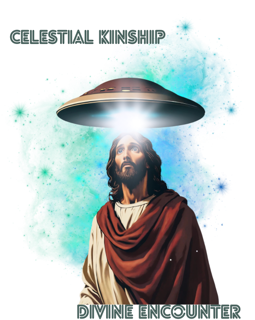 • Obraz przedstawia postać, przypominającą tradycyjne wyobrażenia Jezusa, spoglądającą na UFO.
