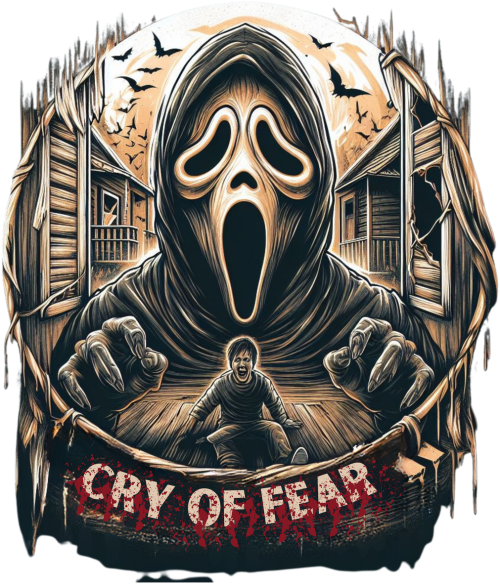Ta nawiedzająca ilustracja przedstawia upiorną postać w krzyczącej masce, oświetloną bladym światłem. Z jej otwartych ust wydobywa się cichy krzyk. Ręce postaci wyciągają się w stronę widza, sugerując zbliżające się niebezpieczeństwo. Tło przedstawia opuszczony krajobraz z drewnianymi domami. Trzepoczące nietoperze dodają ruchu i chaosu. Krwistoczerwony napis "SCREAM OF FEAR" w dolnej części obrazu podkreśla atmosferę grozy.