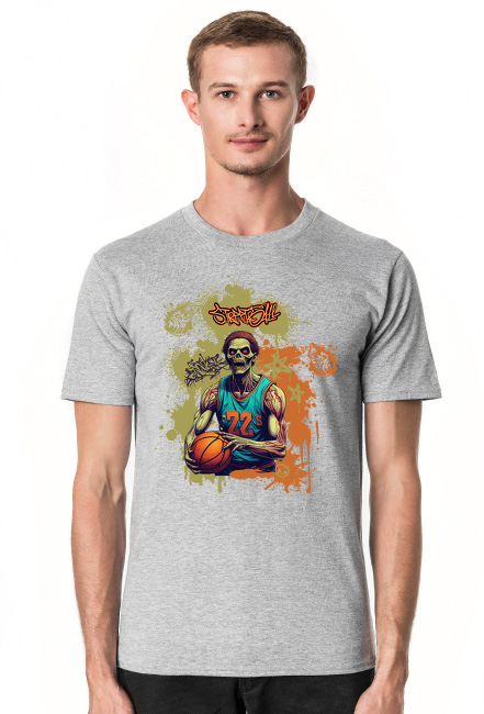 Ta dynamiczna grafika oddaje istotę koszykówki ulicznej dzięki żywej ilustracji gracza zombie w akcji. Na tle graffiti i motywów miejskich, centralna postać emanuje chłodną pewnością siebie. Gracz, ubrany w koszulkę z numerem 72, trzyma piłkę do koszykówki, chwilę koncentracji przed meczem. Odważne pomarańczowe odcienie piłki uderzająco kontrastują z ziemistymi tonami i plamami, które nadają temu dziełu ostry, uliczny styl. Subtelne elementy Halloween, takie jak niesamowite cienie i odrobina upiornej atmosfery, dodają wyjątkowego charakteru tej miejskiej scenie.