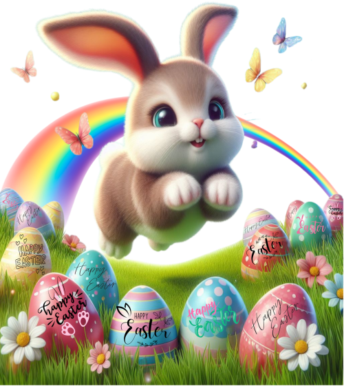 Zanurz się w magicznym świecie Wielkanocy dzięki tej tętniącej życiem grafice, przedstawiającej figlarnego króliczka pośród kolorowego krajobrazu. Otoczony pięknie udekorowanymi pisankami, kwitnącymi kwiatami i trzepoczącymi motylami, króliczek siedzi pod promienną tęczą, dodając odrobinę kaprysu do sceny. Ten element jest idealny do wniesienia radosnego ducha Wielkanocy do każdej przestrzeni.