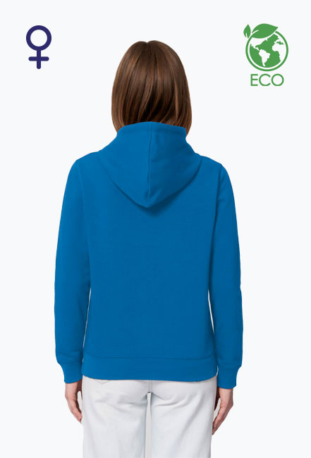 Bluza z kapturem damska z linii Eco Awar. Posiada kaptur z podszewką z pojedynczego dżerseju, kieszeń kangurkę, wszywane rękawy oraz ściągacze przy rękawach i u dołu. Skład materiałowy: 85% organiczna bawełna czesana ring spun, 15% poliester pochodzący z recyklingu. Gramatura 280 g/m². Posiada certyfikaty: GOTS (Global Organic Textile Standard), GRS, OCS, OEKO-TEX Standard 100, Fair Wear.