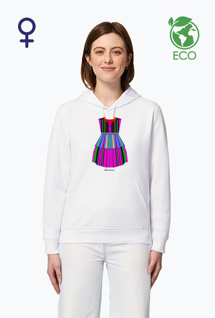 Bluza z kapturem damska z linii Eco Awar. Posiada kaptur z podszewką z pojedynczego dżerseju, kieszeń kangurkę, wszywane rękawy oraz ściągacze przy rękawach i u dołu. Skład materiałowy: 85% organiczna bawełna czesana ring spun, 15% poliester pochodzący z recyklingu. Gramatura 280 g/m². Posiada certyfikaty: GOTS (Global Organic Textile Standard), GRS, OCS, OEKO-TEX Standard 100, Fair Wear.
