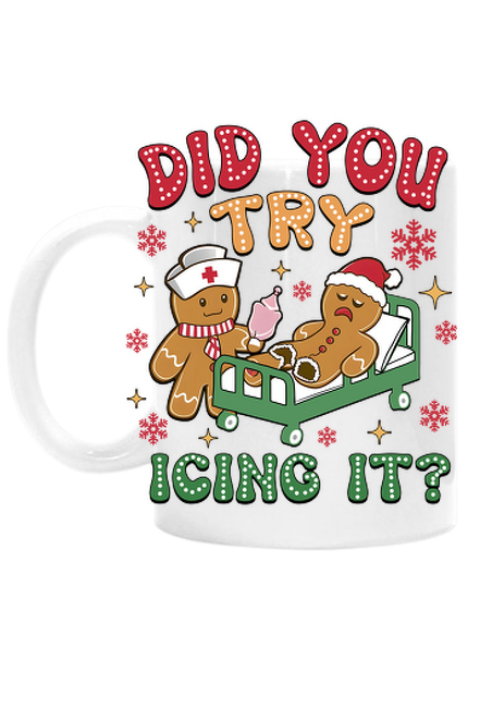 Świąteczny kubek z uroczym motywem świątecznych ciastek i zabawnym napisem 'Did You Try Icing It?'. Idealny do serwowania gorącej czekolady, herbaty lub kawy w świąteczny poranek! Świetny pomysł na prezent dla miłośników słodkości i świątecznych smaków. Kubek wykonany z wysokiej jakości materiałów, odporny na codzienne użytkowanie.