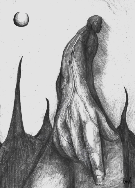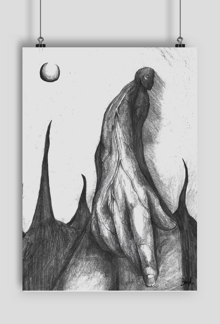 Wydruk rysunku o tematyce fantasy wykonanego ołówkiem.