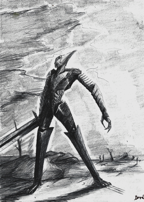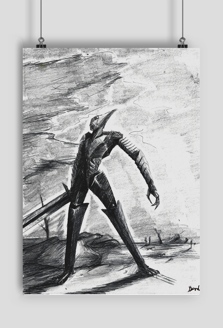 Wydruk rysunku o tematyce fantasy wykonanego ołówkiem.