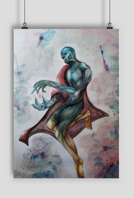 Wydruk rysunku o tematyce fantasy wykonanego kredkami oraz farbą akrylową.