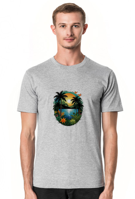Koszulka z motywem zachodzącego słońca to wyraz harmonii z naturą i spokoju, który przenosi Cię w świat wieczornego uroku tropikalnych plaż. Na przedzie koszulki widać pejzaż z palmami, które majestatycznie wyłaniają się zza delikatnych fal oceanu, a w tle rozciąga się niebo płonące odcieniami zachodzącego słońca. Ta koszulka to zaproszenie do podróży w głąb tropikalnego raju, gdzie czas wydaje się zatrzymać, a każdy moment jest pełen magii. Poczujesz na sobie ciepłe promienie zachodzącego słońca, usłyszysz szum fal i poczujesz delikatny zapach soli morskiej. Niech ta koszulka stanie się Twoim przewodnikiem w podróży przez piękno przyrody i niezapomnianych chwil spędzonych na plaży w otoczeniu palm i błękitnego oceanu.