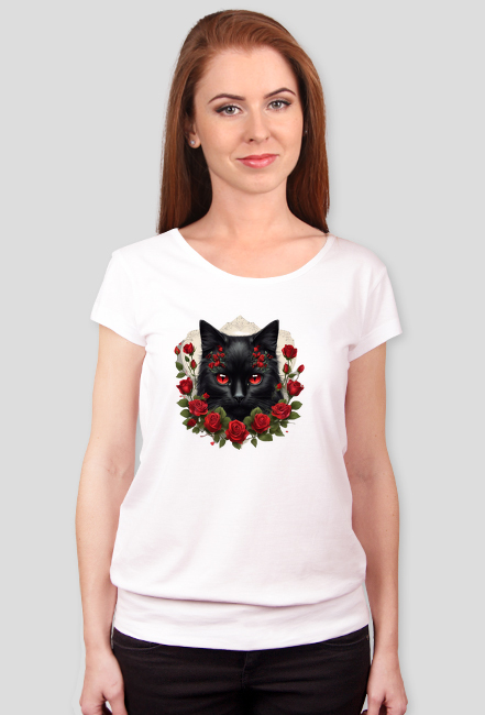 Czy kochasz koty tak bardzo, że chciałabyś nosić je zawsze przy sobie? Ta koszulka jest dla Ciebie! Nasz uroczy kot otoczony różami sprawia, że ta koszulka jest idealna dla miłośniczek zwierząt i kwiatów. Dodatkowo, nie musisz się martwić o alergie, które często towarzyszą posiadaniu prawdziwych kotów! Wybierz tę koszulkę i dodaj trochę uroku swojej garderobie. Bądź oryginalna, bądź wyjątkowa - ta koszulka Ci w tym pomoże! Kup już teraz!