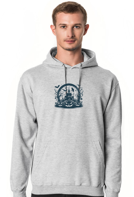 Bluza męska z Halloweenową grafiką dyni i upiornego domu. Idealna dla każdego, kto lubi unikatowe wzory i chce wyróżnić się z tłumu niepowtarzalną grafiką. Doskonały pomysł na prezent dla fanów duchów, horrorów, Halloween oraz wszelkiego rodzaju zabawnych grafik.
