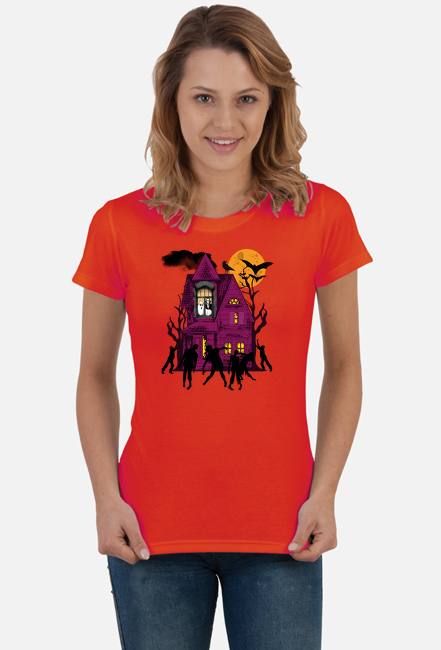 Koszulka damska z Halloweenową grafiką upiornego domu. Idealna dla każdego, kto lubi unikatowe wzory i chce wyróżnić się z tłumu niepowtarzalną grafiką. Doskonały pomysł na prezent dla fanów duchów, horrorów, Halloween oraz wszelkiego rodzaju zabawnych grafik.