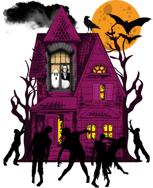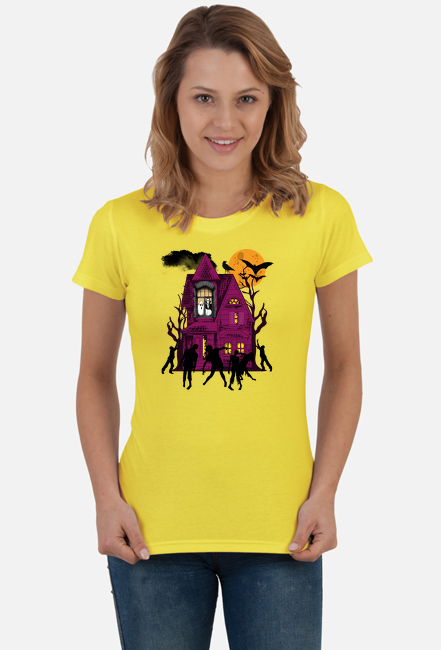 Koszulka damska z Halloweenową grafiką upiornego domu. Idealna dla każdego, kto lubi unikatowe wzory i chce wyróżnić się z tłumu niepowtarzalną grafiką. Doskonały pomysł na prezent dla fanów duchów, horrorów, Halloween oraz wszelkiego rodzaju zabawnych grafik.