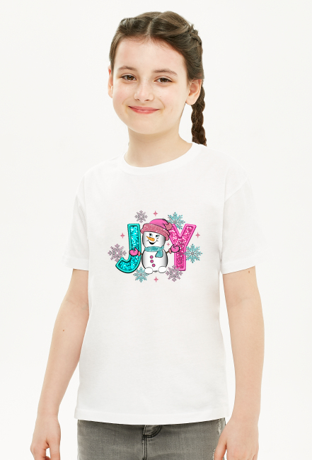 Koszulka dziecięca z grafiką śmiesznego bałwana i napisem "JOY". Efekt cekinów. Doskonały pomysł na prezent.