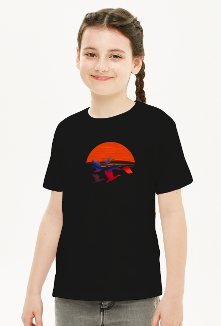 Koszulka dziecięca z grafiką dzikich gęsi na tle zachodzącego słońca. Idealna dla każdego, kto lubi unikatowe wzory i chce wyróżnić się z tłumu niepowtarzalną grafiką.
