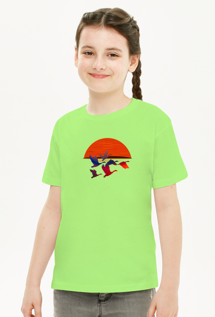 Koszulka dziecięca z grafiką dzikich gęsi na tle zachodzącego słońca. Idealna dla każdego, kto lubi unikatowe wzory i chce wyróżnić się z tłumu niepowtarzalną grafiką.