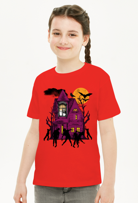 Koszulka z Halloweenową grafiką upiornego domu. Idealna dla każdego, kto lubi unikatowe wzory i chce wyróżnić się z tłumu niepowtarzalną grafiką. Doskonały pomysł na prezent dla fanów duchów, horrorów, Halloween oraz wszelkiego rodzaju zabawnych grafik.