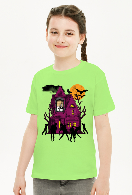 Koszulka z Halloweenową grafiką upiornego domu. Idealna dla każdego, kto lubi unikatowe wzory i chce wyróżnić się z tłumu niepowtarzalną grafiką. Doskonały pomysł na prezent dla fanów duchów, horrorów, Halloween oraz wszelkiego rodzaju zabawnych grafik.