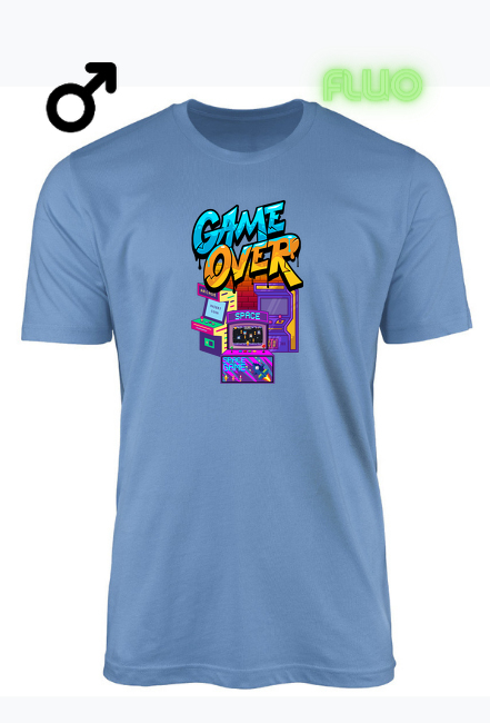 Koszulka męska z kolorową grafiką Game Over. Idealna dla fanów gier komputerowych.