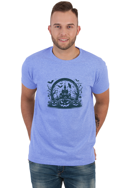 Koszulka męska z Halloweenową grafiką dyni i upiornego domu. Idealna dla każdego, kto lubi unikatowe wzory i chce wyróżnić się z tłumu niepowtarzalną grafiką. Doskonały pomysł na prezent dla fanów duchów, horrorów, Halloween oraz wszelkiego rodzaju zabawnych grafik.