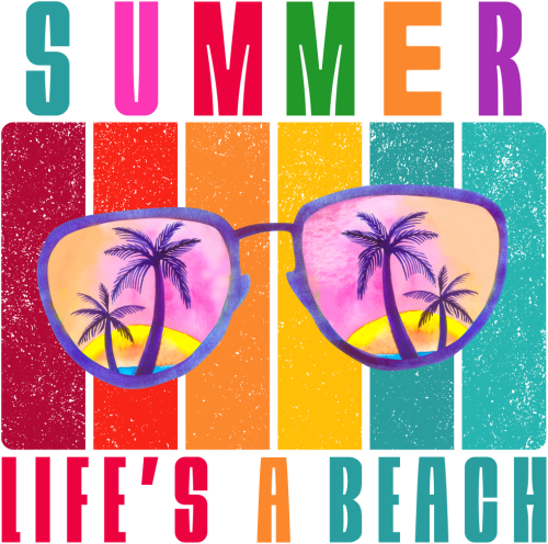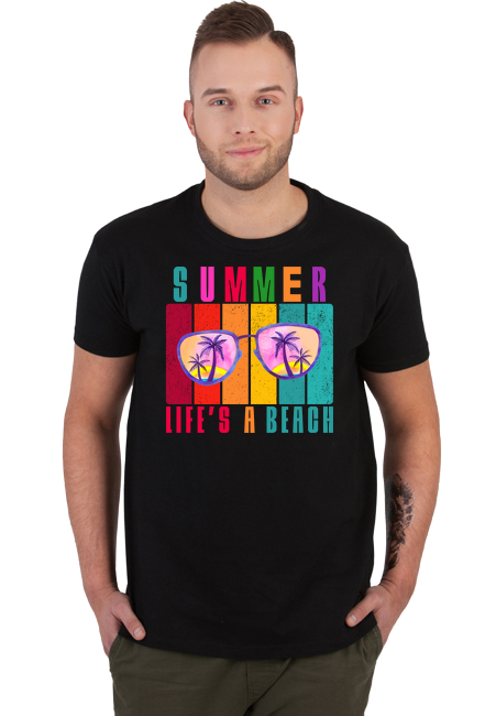 Kolorowa, wakacyjna grafika z okularami przeciwsłonecznymi i tropikalnym widokiem. Hasło „Life’s a Beach” w zabawnym stylu podkreśla letni luz i pozytywną energię. Idealna na plażę, urlop lub po prostu letni vibe.