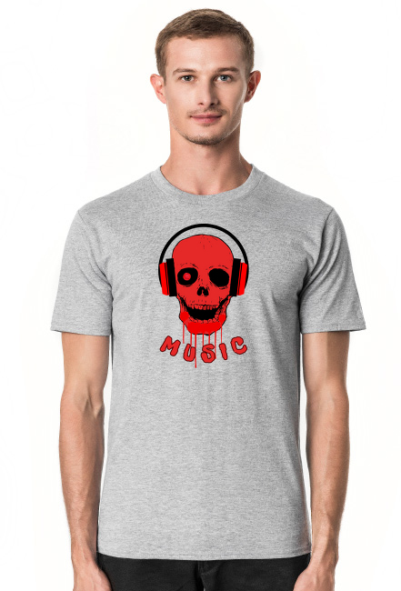 Koszulka męska z zabawną i nieco makabryczną interpretację muzycznego świata, łącząc humor z elementami zaskoczenia poprzez obraz czaszki w słuchawkach. Napis „MUSIC” podkreśla lekki i swobodny charakter motywu.