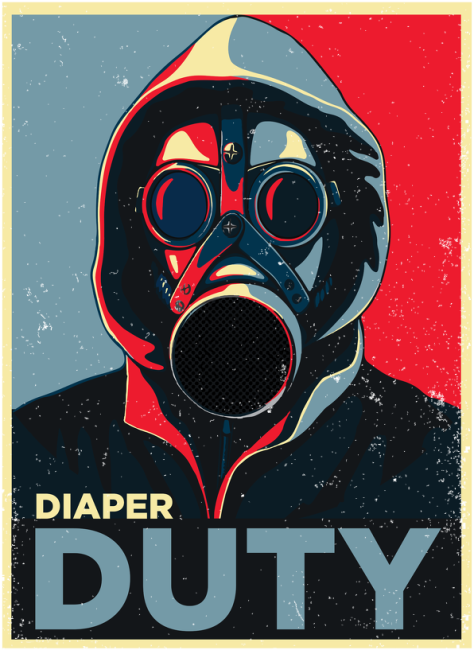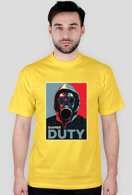 Szukasz koszulki dla przyszłych rodziców malucha? Ta koszulka to idealny śmieszny prezent dla świeżo upieczonego taty.Koszulka z zabawnym nadrukiem umili obowiązki w kolejce dla nowego taty! Koszulka z maską gazową w stylu plakatu z napisem Diaper Duty będzie świetnym prezentem dla przyszłego taty.