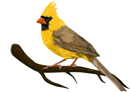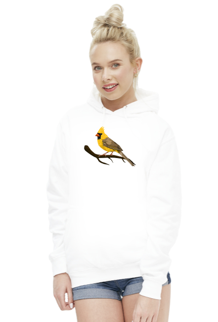 Bluza damska z kapturem w różnych kolorach z aplikacją Żółtego Kardynałka. Rysunek własny.