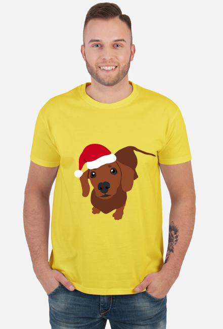 Świąteczny nadruk, przedstawiający uroczego jamnika w czpce świętego Mikołaja.