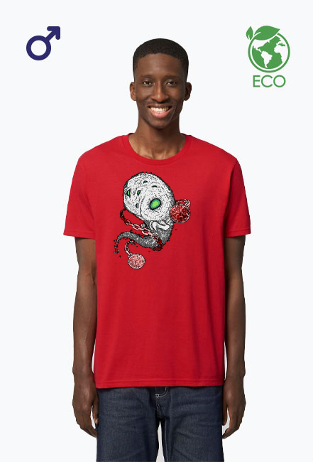 Męska koszulka z linii Eco Aware. Posiada wszywane rękawy, ściągacz na kołnierzyku oraz taśmę wzmacniającą na karku. Rękawy i dół z wąskim podwójnym ściegiem. Materiał: single jersey: 100% organiczna bawełna czesana ring spun. Gramatura 150 g/m². Posiada certyfikaty: GOTS (Global Organic Textile Standard), GRS, OCS, OEKO-TEX Standard 100, Fair Wear.
