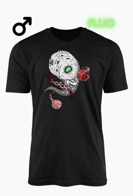 Koszulka z nadrukiem fluorescencyjnym. Pod wpływem ekspozycji na światło słoneczne lub sztuczne – nadruk świeci w ciemności! Koszulka z nadrukiem fluo to świetny pomysł na oryginalne przebranie na Halloween.