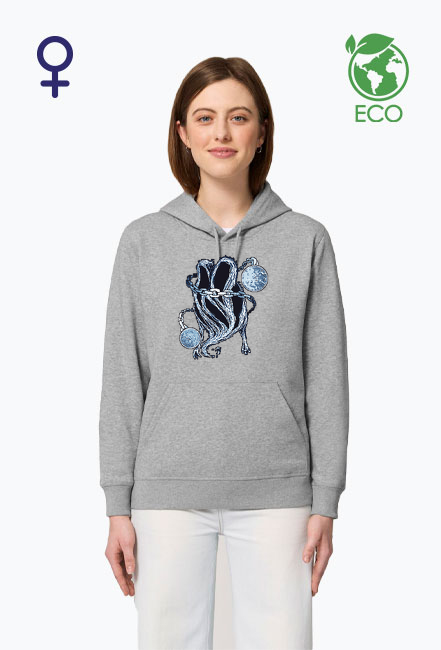 Bluza z kapturem damska z linii Eco Awar. Posiada kaptur z podszewką z pojedynczego dżerseju, kieszeń kangurkę, wszywane rękawy oraz ściągacze przy rękawach i u dołu. Skład materiałowy: 85% organiczna bawełna czesana ring spun, 15% poliester pochodzący z recyklingu. Gramatura 280 g/m². Posiada certyfikaty: GOTS (Global Organic Textile Standard), GRS, OCS, OEKO-TEX Standard 100, Fair Wear.