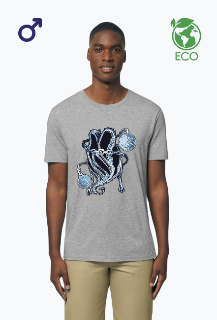 Męska koszulka z linii Eco Aware. Posiada wszywane rękawy, ściągacz na kołnierzyku oraz taśmę wzmacniającą na karku. Rękawy i dół z wąskim podwójnym ściegiem. Materiał: single jersey: 100% organiczna bawełna czesana ring spun. Gramatura 150 g/m². Posiada certyfikaty: GOTS (Global Organic Textile Standard), GRS, OCS, OEKO-TEX Standard 100, Fair Wear.