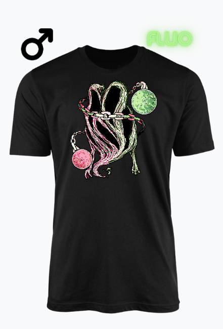 Koszulka z nadrukiem fluorescencyjnym. Pod wpływem ekspozycji na światło słoneczne lub sztuczne – nadruk świeci w ciemności! Koszulka z nadrukiem fluo to świetny pomysł na oryginalne przebranie na Halloween.