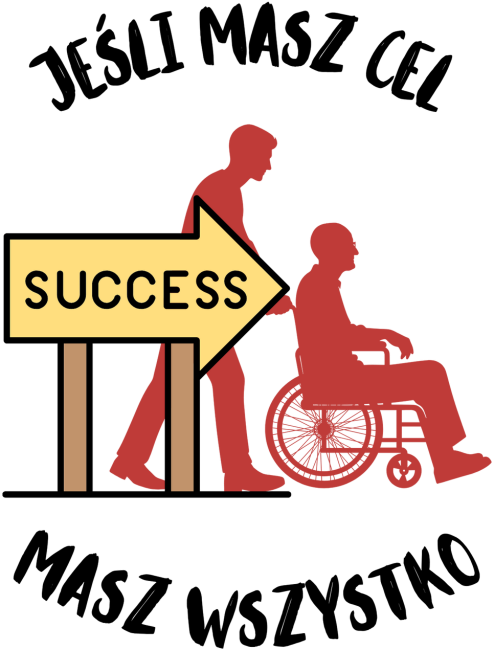 Ta koszulka jest pełna inspiracji i determinacji. Napis „JEŚLI MASZ CEL, MASZ WSZYSTKO” zachęca do wytrwałości i dążenia do swoich marzeń, niezależnie od przeciwności losu. Na środku koszulki, między napisami, znajduje się motywacyjny znak kierunkowy wskazujący w stronę „SUCCESS” (SUKCES). Poniżej znaku widnieje grafika przedstawiająca mężczyznę na wózku inwalidzkim, którego drugi mężczyzna pcha w stronę wyznaczoną przez znak, symbolizując wsparcie i współpracę w dążeniu do celu.