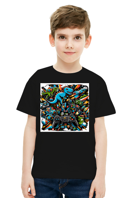 Przygotuj się na przygodę z naszą najnowszą koszulką chłopięcą, która zabierze każdego małego odkrywcę w podróż do świata dinozaurów i gier wideo! Centralnym punktem koszulki jest dynamiczny i kolorowy design, który łączy w sobie elementy retro i nowoczesne, z realistycznie przedstawionym kontrolerem do gier, otoczonym przez wesołe dinozaury, statki kosmiczne i roboty.