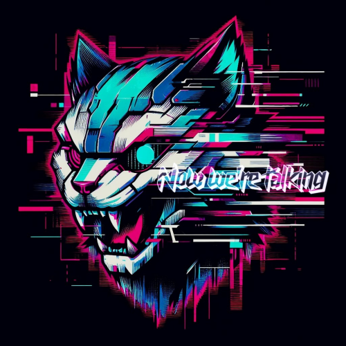 Koszulka przedstawia głowę kota - cyborga, w stylu komiksowym, wypowiadającego kwestię "Now we're talking'', sugerującą odważne podejście do wyzwań.