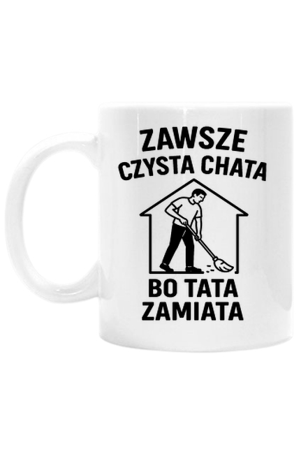 Kubek na dzień ojca z napisem: ZAWSZE CZYSTA CHATA BO TATA ZAMIATA