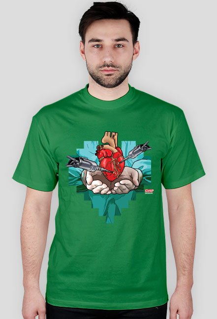 Koszulka z wizerunkiem serca, na którym przeprowadzana jest skomplikowana operacja. Ilustracja została wykorzystana do artykułu "Wirtualne leczenie prawdziwych chorób" na CHIP.pl. Autorem ilustracji jest Piotr Sokołowski.