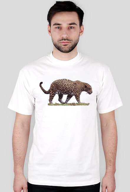 Jaguar na koszulce to oryginalny wzór graficzny wykonany z niemałą precyzją. Skradający się dziki kot pokrtyty finezyjnymi centkami.
