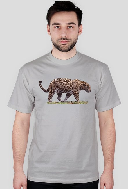 Jaguar na koszulce to oryginalny wzór graficzny wykonany z niemałą precyzją. Skradający się dziki kot pokrtyty finezyjnymi centkami.
