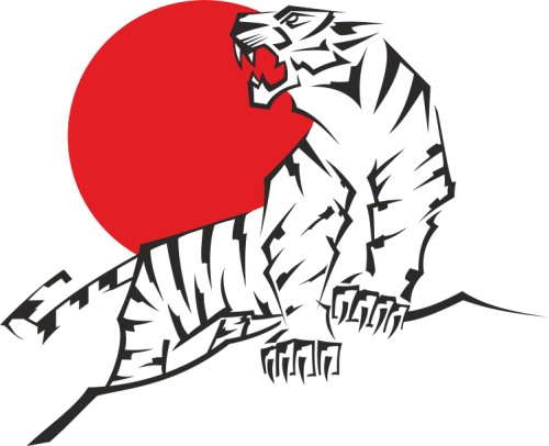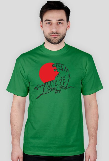 Ryczący tygrys na tle czerwonego, japońskiego słońca. Wzór wykonano przy użyciu dówch kolorów: czarnego i czerwonego, reszta stanowi oryginalny materiał koszulki.