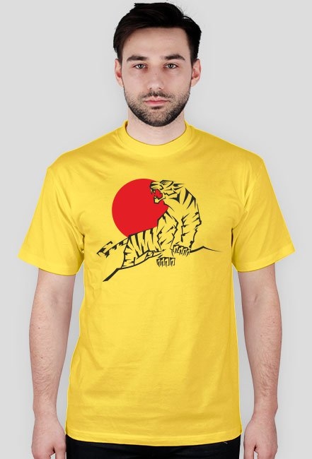 Ryczący tygrys na tle czerwonego, japońskiego słońca. Wzór wykonano przy użyciu dówch kolorów: czarnego i czerwonego, reszta stanowi oryginalny materiał koszulki.